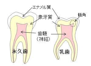 乳歯は、エナメル質・象牙質ともに永久歯に比べて半分の厚みです。また、髄角が突出しています。